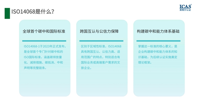 在主题分享中,ICAS英格尔认证聚焦ISO14068这一全球首个碳中和量化国际标准,结合文旅产业特色与行业发展需求,从政策背景、市场需求、标准落地、价值转化四大维度,系统解读了文旅产业零碳转型的全链条解决方案。据悉,ISO14068涵盖碳排放量化、减排措施、碳抵消、中和声明等完整链条,具有跨国互认、公信力高、适用范围广的特点,是文旅企业构建碳中和能力体系的核心基础。ICAS英格尔认证依托成熟的ISO14068碳中和核查流程,从排放数据核查、减排措施验证、碳抵消项目审核到中和声明签发,为文旅活动、景区运营、文旅项目提供全流程标准化认证服务,最终颁发碳中和证书,为文旅企业投标资质、ESG报告披露、品牌宣传提供可验证的公信力保障。
